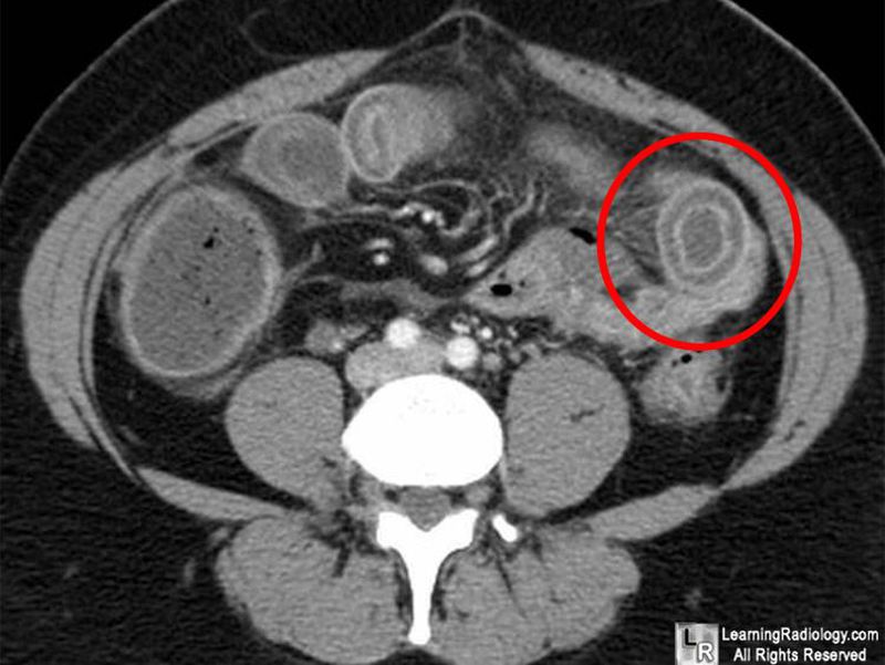 In which disease we see that? 1.appendicitis 2.diverticulitis 3. intussusception 4.colon obstruction