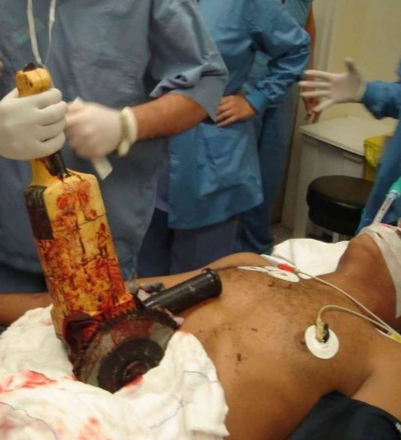 A farmer has survived after being taken to hospital with a circular power saw lodged 10cm into his abdomen. He was sawing wood at his home when the tool slipped and sliced through his abdomen. His wife carried out first aid to stop the bleeding before taking the 56-year-old to the nearest hospital 30 miles away. The blade apparently missed all his vital organs and doctors took two-and-a-half hours to remove the tool.