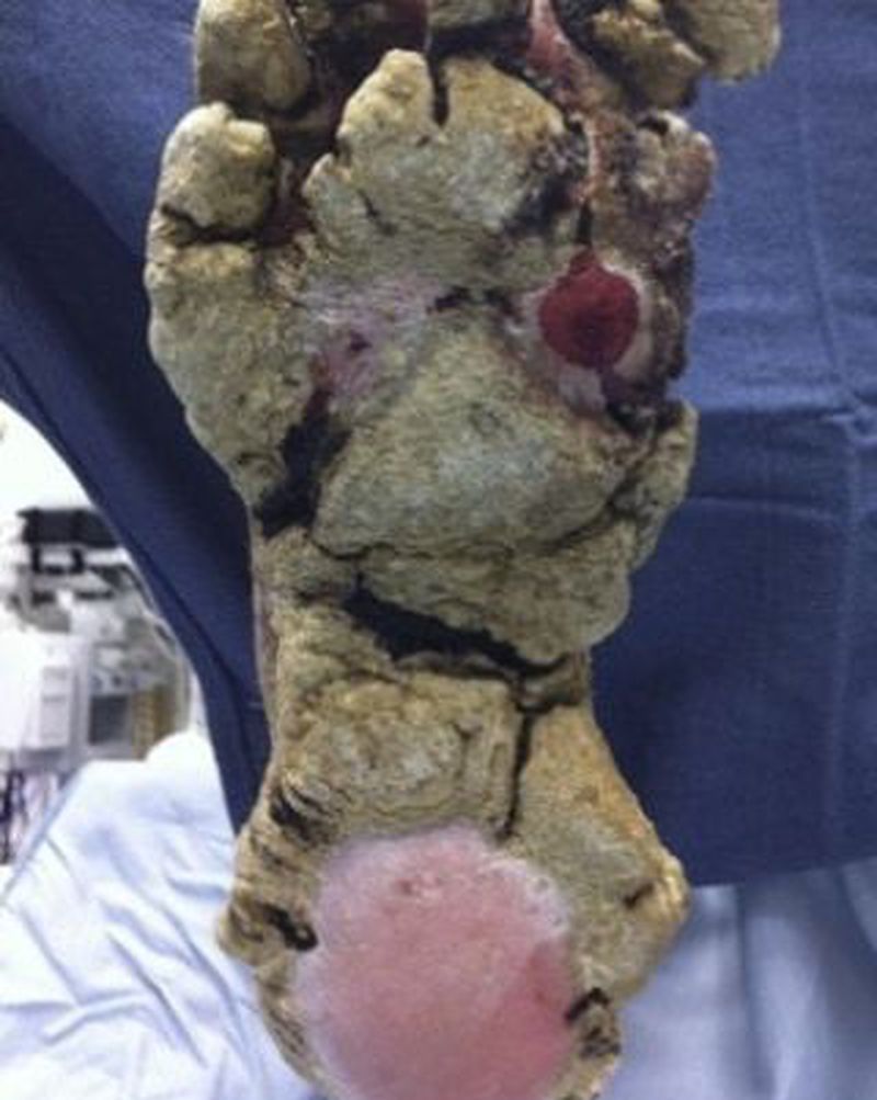 Crusted scabies (also called Norwegian scabies) is a severe form of scabies that most often occurs in people who have a weakened immune system or a neurological disease, the elderly, the disabled, or those who are mentally impaired. The condition is characterized by thick crusts of skin that contain large numbers of scabies mites and eggs. The usual features of scabies (itching and a rash) may be absent. Crusted scabies is very contagious and can spread easily both by direct skin-to-skin contacts and through contaminated items such as clothing, bedding, and furniture. It is caused by superinfestation with Sarcoptes scabiei var hominis, but why the crusted scabies develops is unknown. People with crusted scabies should receive quick and aggressive medical treatment for their infestation to prevent outbreaks of scabies. Ivermectin is commonly used for treatment