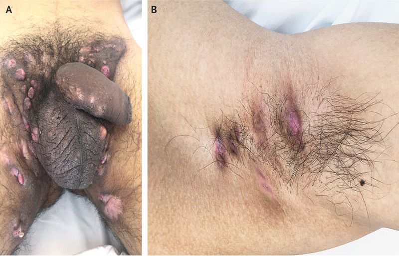 A 27-year-old man presented to the Center for Tropical Diseases at our hospital with a 2-year history of acne and the recurrence of multiple painful lesions in the genital and perineal areas. He had previously been treated with multiple courses of antibiotic agents and with surgical treatments (repeated attempts to incise and drain) without resolution. Examination revealed inflamed and noninflamed nodules and scar tissue in the genitofemoral area (Panel A) and axilla (Panel B), as well as in the intergluteal area and behind the ears. A clinical diagnosis of hidradenitis suppurativa (Hurley stage II, on a scale of I to III, with higher stages indicating more abscesses and a greater affected region) was made. Hidradenitis suppurativa is a chronic, inflammatory, recurrent skin disease of the hair follicles. The cause of hidradenitis suppurativa is unclear, involving multiple causal factors, such as genetic and environmental factors. It usually manifests after puberty with painful, deep-seated, inflamed lesions in the apocrine gland–bearing areas of the body, most commonly the axillae and the inguinal and anogenital regions. Delays in diagnosis are common, because lesions are often initially mistaken for simple infections. Lesions may be slow to heal and may lead to sinus tracts and scarring. Treatment includes a combination of surgery and topical and systemic antibiotics (often doxycycline or rifampin combined with clindamycin); in severe cases, systemic immunosuppressive agents may be considered. The patient underwent 2 weeks of systemic antibiotic therapy and began a lifestyle-modification program that included smoking cessation. No improvement in his condition was noted. The patient was advised to go to a referral center for dermatology that focused on hidradenitis suppurativa. The patient was lost to follow-up.