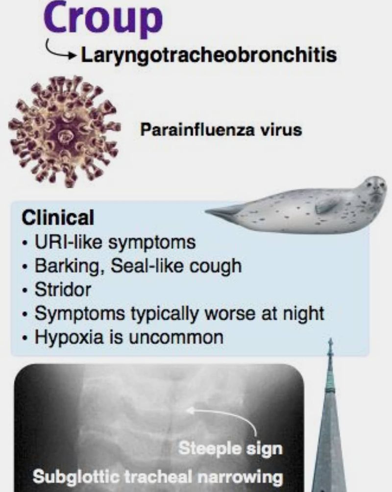 Croup, also known as laryngotracheobronchitis, is a type of respiratory infection that is usually caused by a virus.The infection leads to swelling inside the trachea, which interferes with normal breathing and produces the classic symptoms of "barking" cough, stridor, and a hoarse voice.Fever and runny nose may also be present.These symptoms may be mild, moderate, or severe. Often it starts or is worse at night. It normally lasts one to two days.