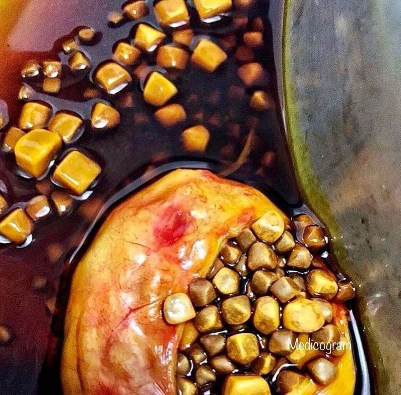 This is a gallbladder full of stones! This condition is known as Cholelithiasis (Presence of stones in the gallbladder). Types of gall stones: The common types of gallstones are cholesterol stones, black pigment and brown pigment. Cholesterol gallstones occur more frequently in female gender as compared to male. Black pigment gallstones occur when there is increased destruction of red blood cells, while brown pigment gallstones occur when there is reduced flow and infection of bile duct. CHOLELITHIASIS: Signs & symptoms: Nausea, vomiting, diarrhoea, obesity, elevated blood triglyceride levels, clay coloured stools, dark urine and Crohn's disease are common symptoms. Causes: It's not clear what causes gallstones to form. Doctors think gallstones may result when: 1)Your bile contains too much cholesterol. 2) Your bile contains too much bilirubin. 3) Your gallbladder doesn't empty correctly. Diagnosis: Diagnosis is confirmed after the doctor examine patient's gallbladder using Ultrasound, abdominal CT scan, Gallbladder radionuclide scan, blood test etc. Treatment: Most of the time, you wonât need treatment for gallstones unless they cause you pain. Sometimes you can pass gallstones without even noticing. If youâre in pain, your doctor will likely recommend surgery. In rare cases, medication may be prescribed.