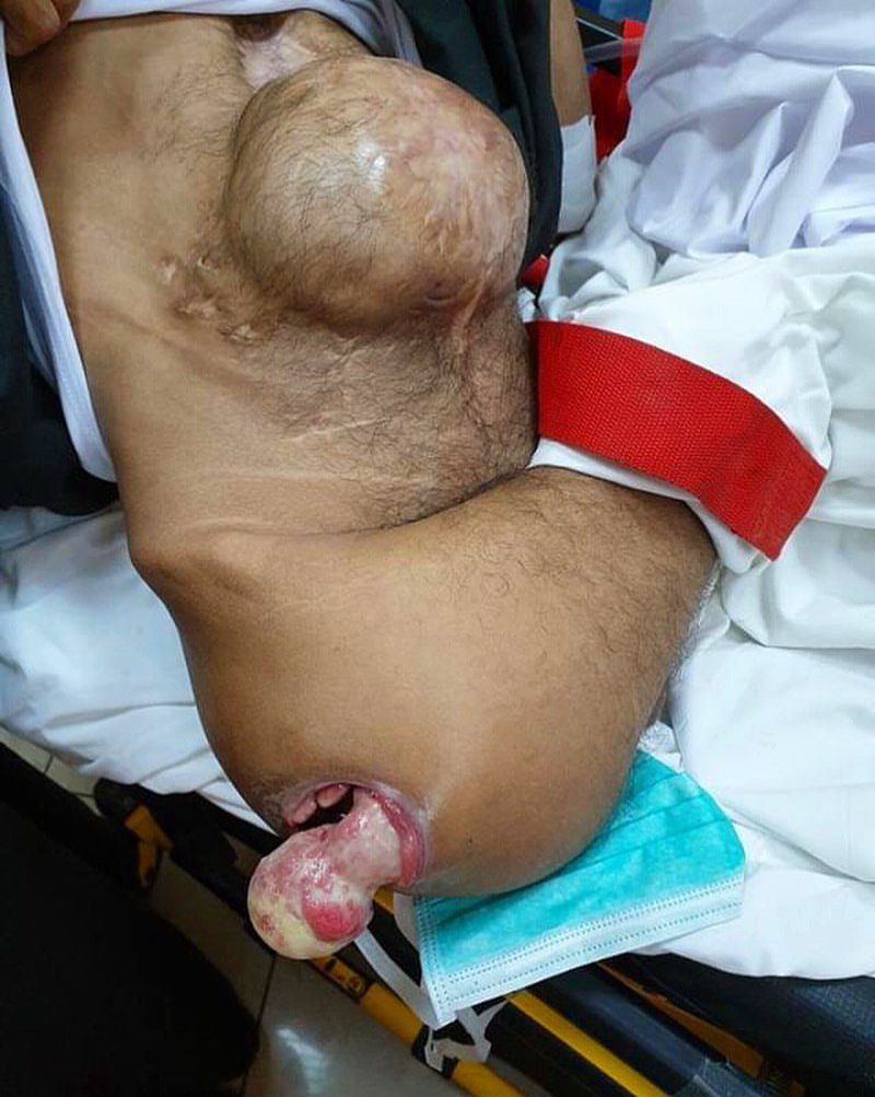 This isnt a typical injury you see everyday, the ball shaped head of the femur just popped out! The dislocation happened secondary to an extensive stage 4 full thickness decubitus ulcer, bedsore, or pressure ulcer of the buttocks. This is a skin ulcer caused by prolonged pressure against the skin resulting in completely or partially obstructed blood flow to the soft tissue (results from ischemic necrosis following continuous pressure on an area of skin that restricts microcirculation). Those lesions can ulcerate down to the bone and become infected, which further might lead to sepsis and death. In this case, the head of the femur came out of the cupâshaped acetabulum of the pelvis and through the open ulcer. Major skin breaks like the one seen above are treated with aggressive surgical debridement and antibiotics for the prophylaxis of possible infection. The patient also had an enormous abdominal incisional hernia, a type of hernia caused by an incompletely-healed surgical wound. A median incision in the abdomen is clearly seen, which was done for an exploratory surgery, leaving this patient at risk for hernia and a long hospital stay.