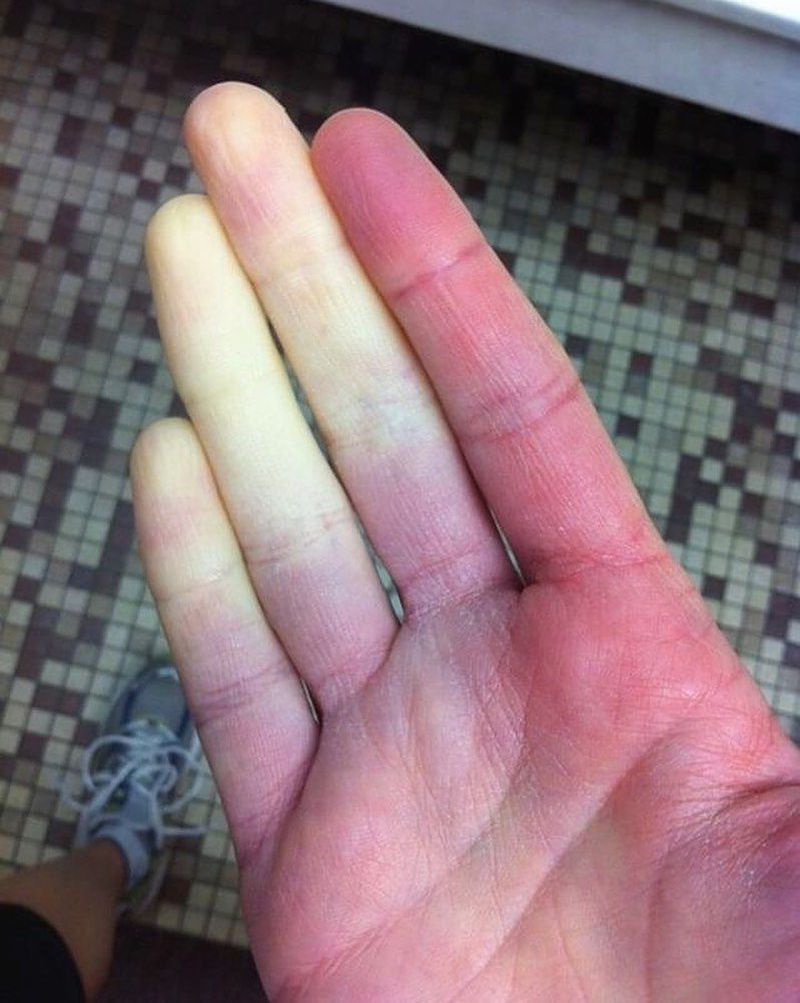 It is essentially a vasospastic disorder causing discoloration of the fingers, toes, and occasionally other extremities. The cause of the phenomenon is unknown,but it is a disorder characterized by cold or stress-induced hyperreactivity of the digital arterial smooth muscle, leading to episodic vasospasm in the fingers and toes, the body parts that are usually most susceptible to cold injury. Subsequently, it is the cause of finger ischemia that typically progresses from pallor (due to vasoconstriction) to cyanosis to erythema (red due to rapid blood reflow), and accompanied by pain. In the image, a clear line of demarcation exists between the ischemic and unaffected areas. These effects are reversible, and they must be distinguished from irreversible causes of ischemia such as vasculitis or thrombosis. Rarely, tissue necrosis occurs distal to the affected vessel, usually in the periphery of the vasculature. Drug treatment is normally with a calcium channel blocker, frequently nifedipine to prevent arterioconstriction. Patient education is the cornerstone of management, with patients being advised to avoid cold exposure, maintain the warmth of the whole body (i.e. not just wearing gloves and socks), cease smoking, avoid sympathomimetic medications, and avoid emotional stress where possible.