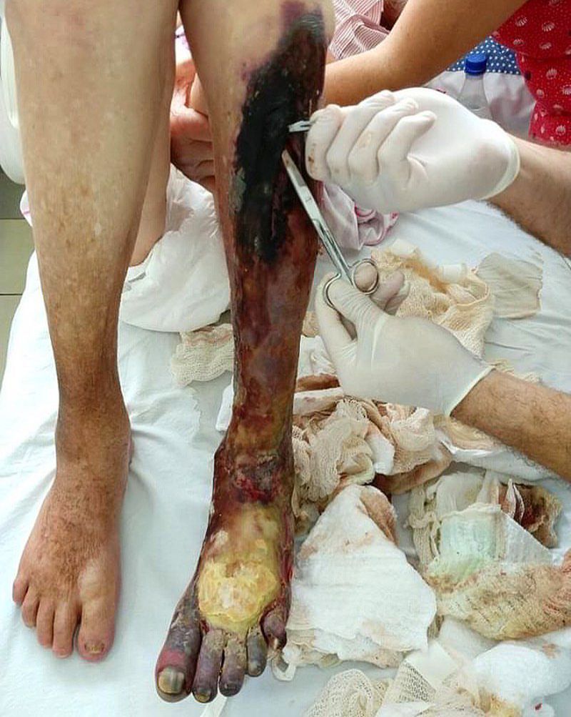 This is a 60-year-old patient who arrived at the emergency room with limb pain, lameness, cold and pale extremities. He was diagnosed with arterial thrombosis with limb ischemia and subsequent necrosis, and evolved with waiting for the public medical service. Unfortunately, due to the severity of his gangrene, the only way out was limb amputation. Arterial thrombosis usually occurs after the erosion or rupture of an atherosclerotic plaque and, through platelet-mediated thrombi, can cause ischemic injuries especially in tissues with a terminal vascular bed. Acute ischemia is defined as a sudden loss of limb perfusion for up to 2 weeks after the initiating event. The occlusion can occur in any peripheral artery of the upper and lower extremities. Once arterial blood flow is impeded, malperfused tissues switch from aerobic to anaerobic metabolism, causing lactate production, acidosis, and an increased concentration of free radicals. Prolonged and untreated ischemia will cause the hypoxic muscle to deplete its ATP stores; this is followed by dysfunction in the sodium/potassium-ATPase and calcium/sodium pump leading to intracellular calcium leakage into the myocytes. Increasing free calcium negatively interacts with the muscle's myosin, actin, and proteases and eventually causes muscle fiber necrosis. The classic presentation of limb ischemia is known as the "six Ps": pallor, pain, paresthesia, paralysis, pulselessness, and poikilothermia. The surgical approach is directed at reperfusion of the affected extremity. This can be accomplished by the surgical bypass, endarterectomy, or embolectomy. Photo by @arthurreimann