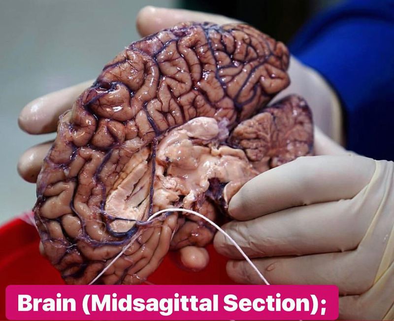 This image shows a midsagittal section of the brain. The midsagittal plane is satisfyingly accurate and divides the right and left hemispheres of the brain into two equal parts or halves, giving us a view of all the complex anatomical structures and landmarks. As seen in the above photo the outer surface is covered by a thin layer of the meninges called the pia matter.