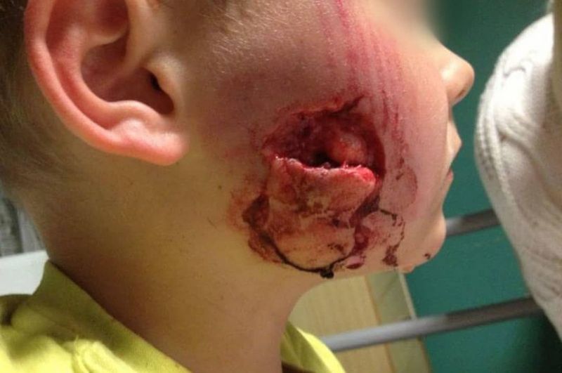 A five year old boy has been left scarred for life after a dog tore off a chunk of his cheek in a ferocious attack! He needed plastic surgery and 29 stitches to repair the gaping wound caused by a bull mastiff at his granmothers house. Jordan was set upon as he was on his way to bed while staying the night at his grandma's home. She explained: âIt all happened in a flash. The dog was lying in the hallway and just jumped up at him. It bit into Jordanâs face and his cheek was hanging down. It was horrific. My son Adam ran into the hallway and beat the dog away and shut him in a bedroom while I phoned 999. Jordan screamed and was bleeding very badly but he was a very brave boy.