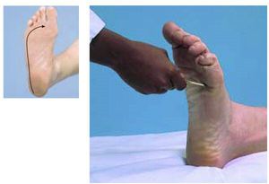 Babinski reflex. Curled toes indicate a positive plantar reflex and a negative babinski