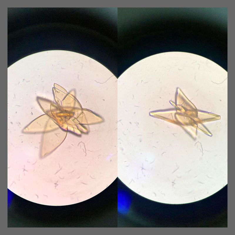 These are uric acid crystals in the microscopy of the urinary sediment. In physiological cases, uric acid crystals may appear after eating meals and strong sweat. In pathological cases, these crystals are observed when exposed to leukosis, pneumonia, and X-rays. At the same time the formation of ammonia which ensures the acid reaction of the urine is disrupted. And that's why we can see the uric crystals in the microscopy.