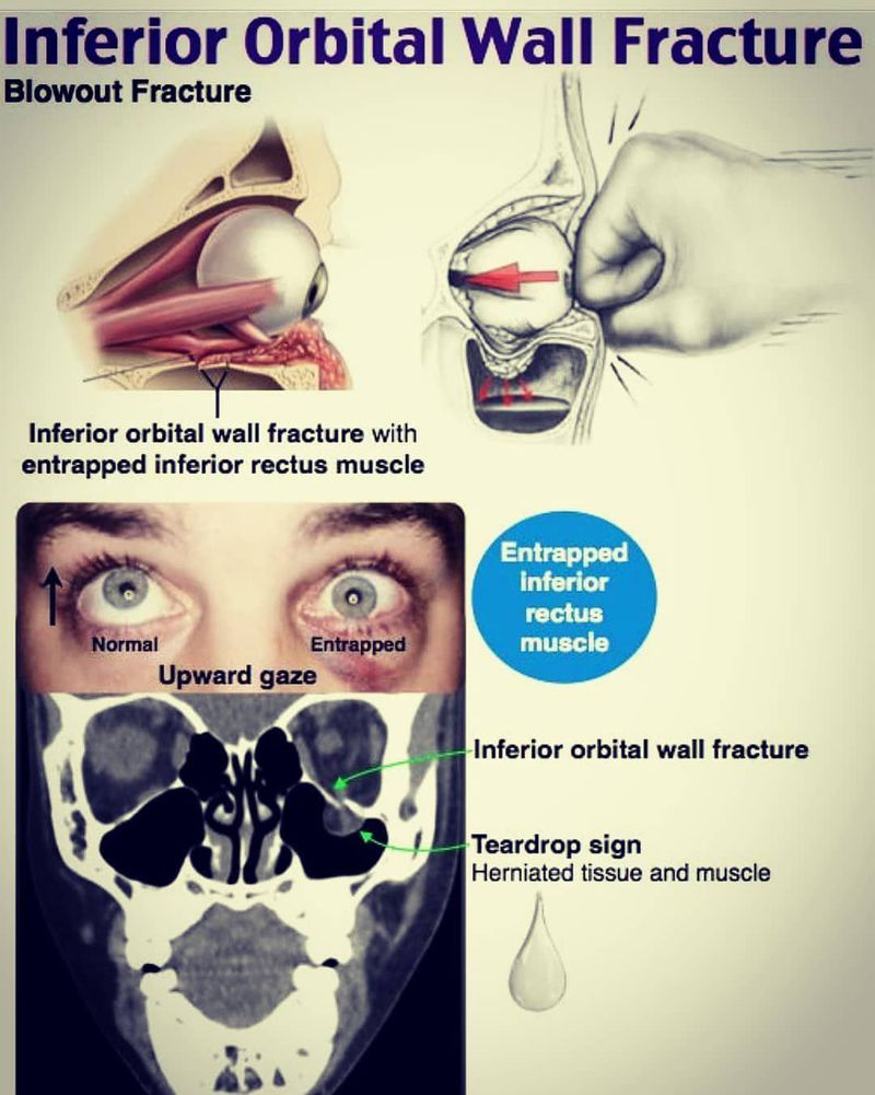 An orbital blowout fracture is a traumatic deformity of the orbital floor or medial wall, typically resulting from impact of a blunt object larger than the orbital aperture, or eye socket. There are two broad categories of blowout fractures: open door, which are large, displaced and comminuted, and trapdoor, which are linear, hinged, and minimally displaced. They are characterized by double vision, sunken ocular globes, and loss of sensation of the cheek and upper gums due to infraorbital nerve injury On Water's view radiograph, polypoid mass can be observed hanging from the floor into the maxillary antrum, classically known as teardrop sign, as it usually is in shape of a teardrop. This polypoid mass consists of herniated orbital contents, periorbital fat and inferior rectus muscle.