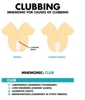 C-Cyanotic heart disease L-Lung cancer U- Ulcerative colitis B- Bronchiectasis, Bronchogenic Ca I-interstitial lung disease N- Neutrogena diaphragmatic Tumor G- Gastric Cancer
