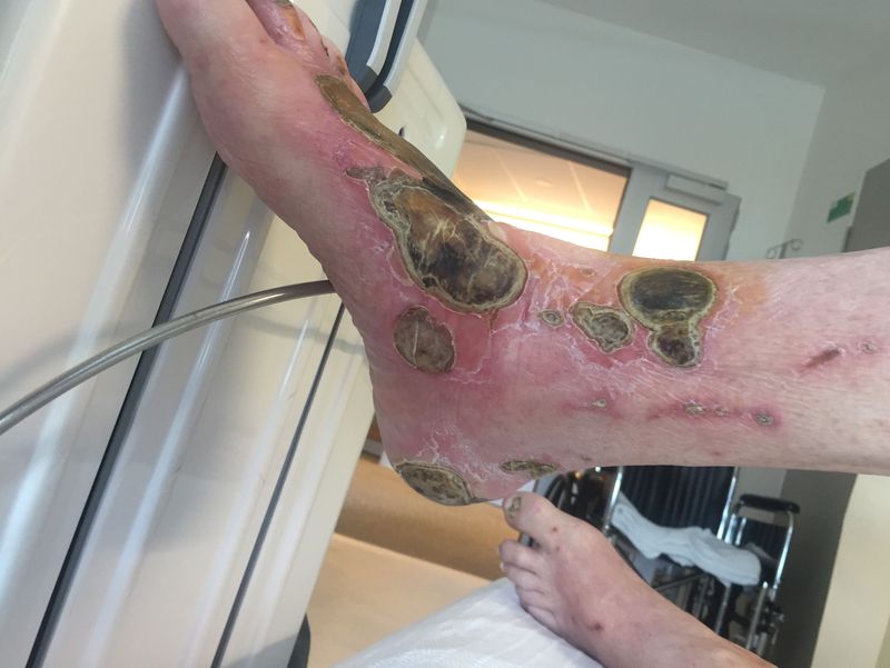 56 yr old gentleman with T2DM, uncontrolled bgl’s and non compliant with medications. Pt had not removed his socks in 1/12, Pt reported nil pain. Subsequently pt had bilaterally foot amputations as the wounds were to the bone.