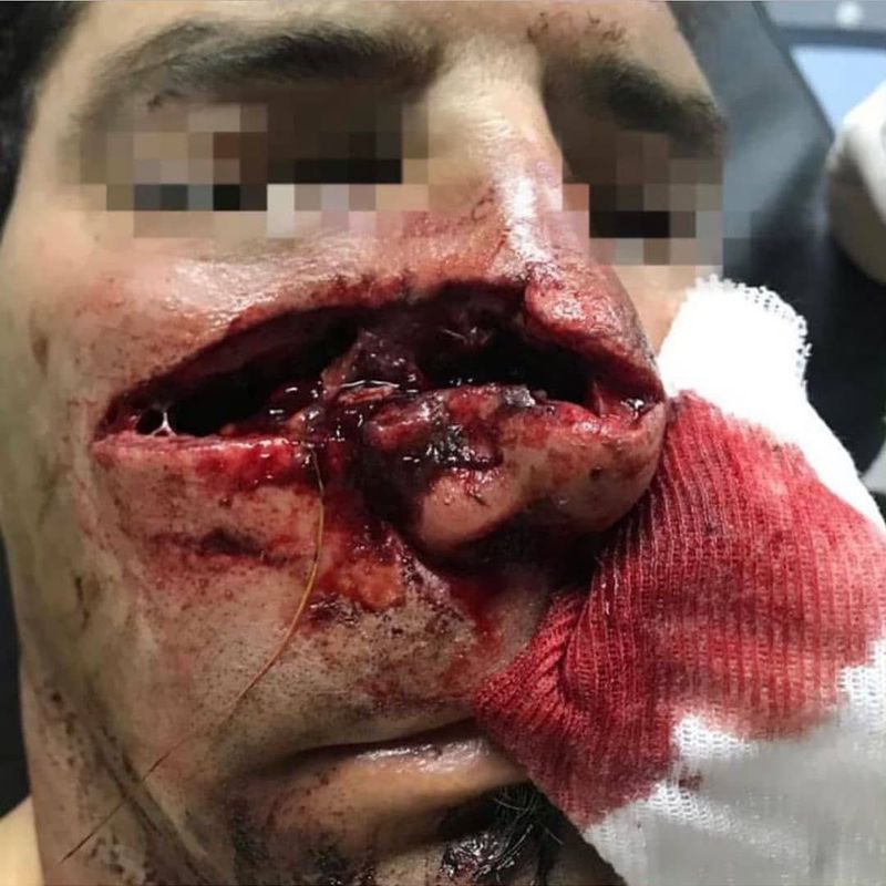 The patient sustained a deep cut across lateral side of the nose and right cheek after being attacked by a wild boar. . The best therapy for wild animal inflicted wounds with special regard to optimal wound healing time, minimum complications and minimal residual functional and aesthetic impairment would be, in our opinion primary wound debridement and sutures with immediate full dose antibiotic therapy alongside tetanus toxoid booster and post exposure rabies prophylaxis. Of course each case of will animal inflicted wounds should be looked at and treated individually with careful assessment of all potential risk factors for complications from the side of the animal itself, species, known microbiological organisms in their oral cavity, etc.) as well as from the side of the injured person (age, comorbidities, possible immunosuppression). .