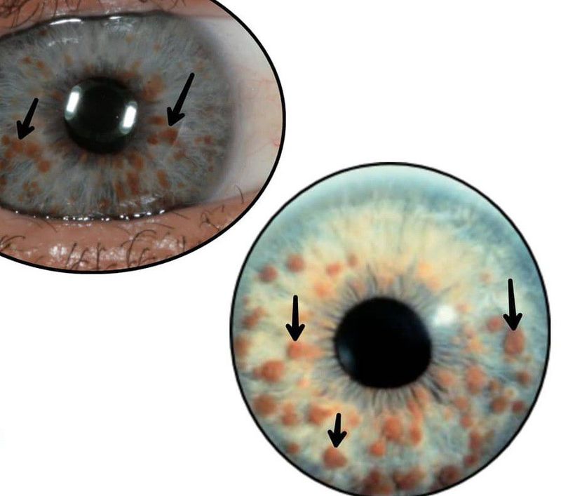 Lisch nodule, also known as iris hamartoma, is a pigmented hamartomatous nodular aggregate of dendritic melanocytes affecting the iris. These nodules are found in neurofibromatosis type 1 They are clear, yellow-brown, oval to round, dome-shaped papules that project from the surface of the iris. These nodules typically do not affect vision, but are very useful in diagnosis.They are detected by slit lamp examination. Immunohistochemistry stains positive against vimentin and S-100, and points to an ectodermal origin.Their precise origin and structure, however, is still under investigation. They are not found in neurofibromatosis type 2