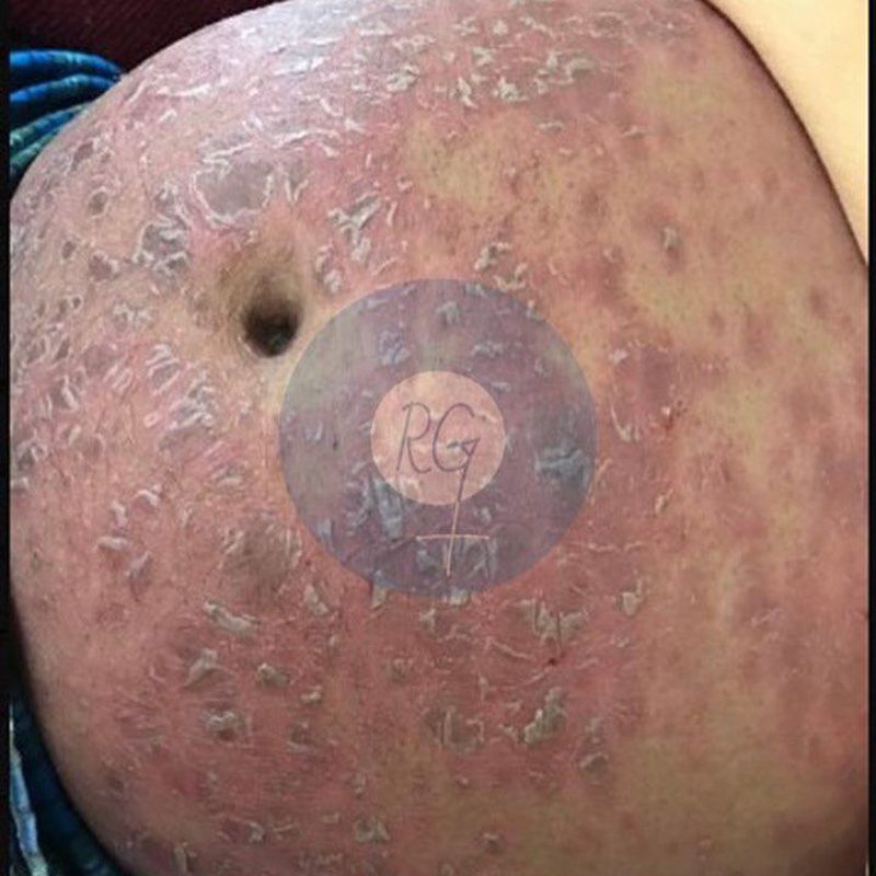 Erythrodermic psoriasis is an uncommon, aggressive, inflammatory form of psoriasis. Symptoms include a peeling rash across the entire surface of the body. The rash can itch or burn intensely, and it spreads quickly. Erythrodermic psoriasis is one of the most severe types of psoriasis. If complications develop, it can be life-threatening. The condition most often affects people who already have unstable plaque psoriasis. It can also occur at the onset of an episode of plaque psoriasis or alongside another rare type of psoriasis called von Zumbusch pustular psoriasis.