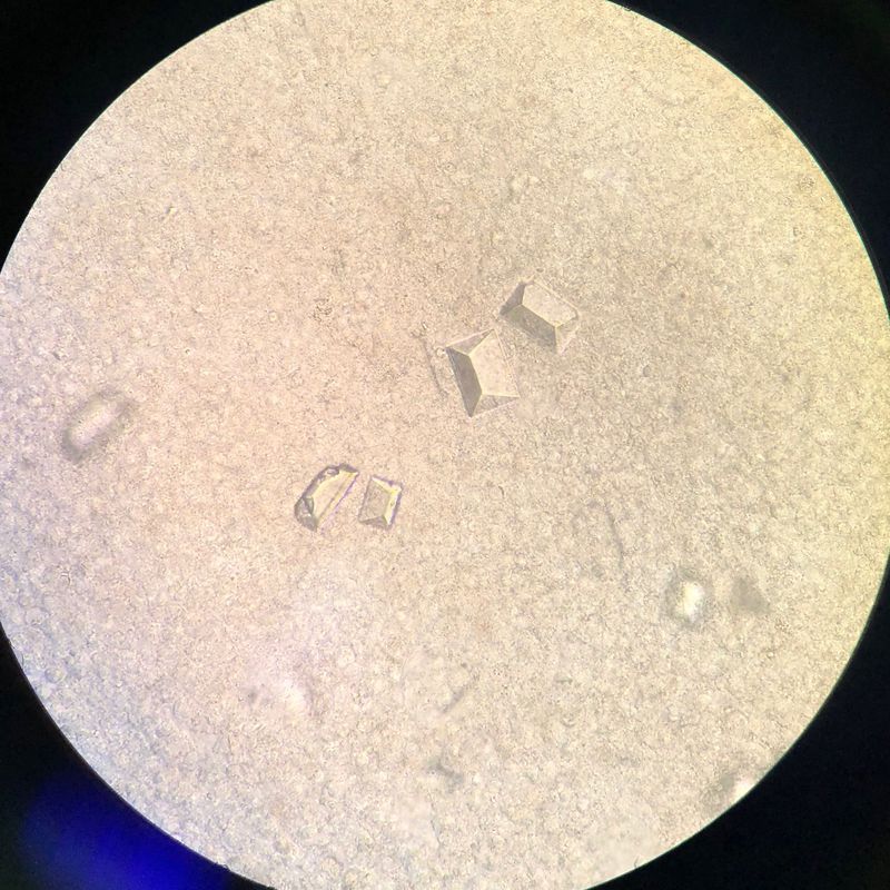 You see the triple-phosphate crystals in the microscopy of the urine sediment. These crystals appear after intaking plant foods and mineral waters, in inflammation of the urine bladder.