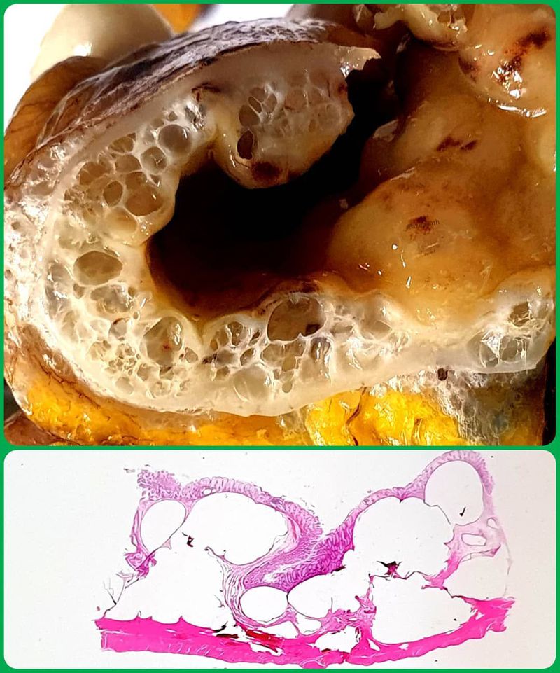 pneumatosis cystoides intestinalis, pneumatosis coli, or intramural bowel gas) is pneumatosis of an intestine, that is, gas cysts in the bowel wall. As a radiological sign it is highly suggestive for necrotizing enterocolitis. This is in contrast to gas in the intestinal lumen (which is relieved by flatulence). In newborns, pneumatosis intestinalis is considered diagnostic for necrotizing enterocolitis, and the gas is produced by bacteria in the bowel wall. The pathogenesis of pneumatosis intestinalis is poorly understood and is likely multifactorial. PI itself is not a disease, but rather a clinical sign. In some cases, PI is an incidental finding, whereas in others, it portends a life-threatening intra-abdominal condition