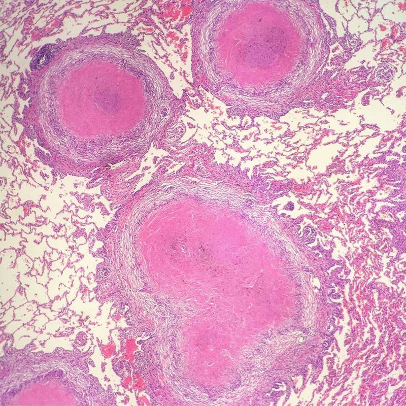 microscopy shows nodular pulmonary lesions with central necrosis surrounded by collagen ,fibroblasts and macrophages (similar to rheumatoid nodules)