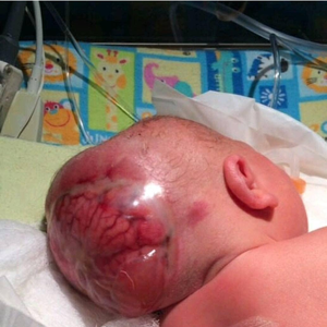 Caput succedqneum is birth trauma and the head get enlarged but the brain still covered