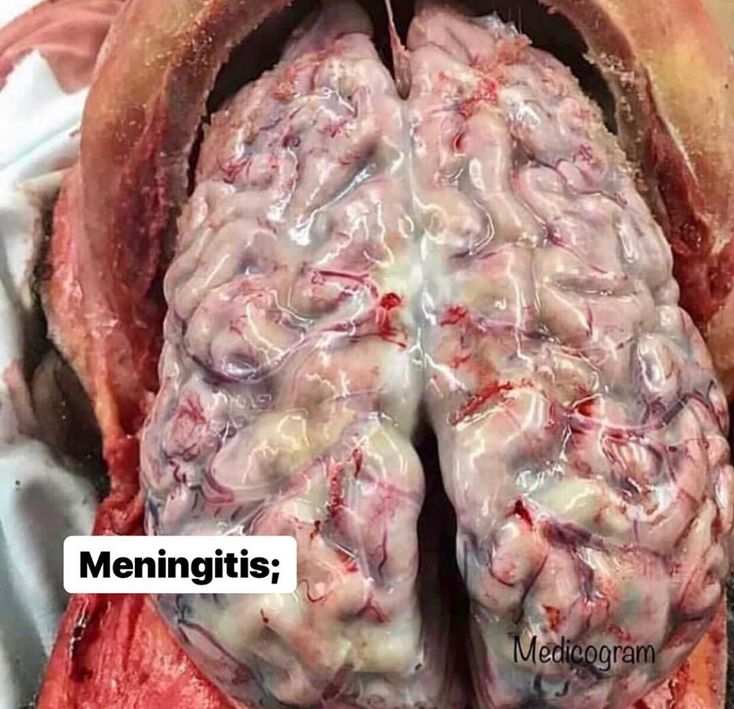 Here's a picture depicting a human brain with severe bacterial meningitis. Bacterial meningitis is a bacterial infectious disease characterized by inflammation of the meninges (the tissues that surround the brain or spinal cord). Effects and symptoms: Permanent disabilities (such as brain damage, hearing loss, and learning disabilities), nausea, headach and fever can result from the infection. Bacterial meningitis is very serious and can be a deadly disease. Death can occur in as little as a few hours. Most people recover from meningitis. Causes: There are several types of bacteria that can cause meningitis. They include the following bacteria; * Streptococcus pneumoniae * Group B Streptococcus * Neisseria meningitidis * Haemophilus influenzae * Listeria monocytogenes Treatment: Doctors treat bacterial meningitis with a number of antibiotics. ie; A class of antibiotics called cephalosporins, especially Claforan (cefotaxime) and Rocephin (ceftriaxone). Various penicillin-type antibiotics, aminoglycoside drugs such as gentamicin etc are also used.