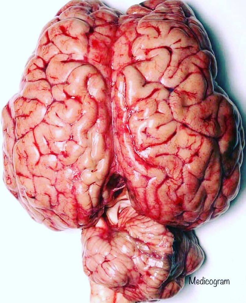 Real photograph of the human brain, portraying its superior aspect. The human brain is the largest brain of all vertebrates relative to body size. It weighs about 3.3 lbs (1.4 Kg). The brain makes up about 2% of the human's body weight. The cerebrum is the largest part of the brain and makes up about 85% of the brain weight. Brain contain over 86 billion nerve cells (neurons), comprising the gray matter & white matter. These neurons are connected by trillions of connections called synapses, which allows for the transmission or passage of nerve impulses within the brain and to and from the pheripheral body.