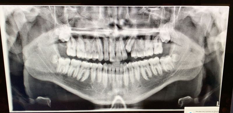 Aside from the impacted k9, look around. Count how many teeth you see. All the wisdoms are there but oh wait....