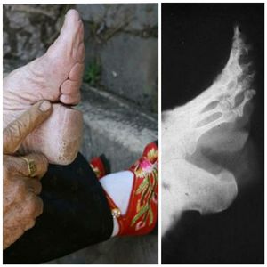 This is a process of so called "footbinding". To achieve this the feet of very young girls were bound generally before the foot’s arch developed fully, usually between the ages of 2 and 5. By design, footbinding stunted and restricted further foot growth, and reshaped the foot, transforming it. A girl’s feet were washed and her toenails trimmed as far back into the quick as possible. The four smaller toes were bent under and forced against the pad of the foot, then pressed with great force downward and squeezed into the sole until the toes broke. This is not a quick process, it takes roughly two years before the foot is “finished”. . A first-hand story from one of the woman: . When I was seven my mother washed and placed alum on my feet and cut my toenails. She then bent my toes toward the plantar with a binding cloth ten feet long and two inches wide doing the right foot first and then the left. She ordered me to walk but when I did the pain proved unbearable. That night my feet felt on fire and I couldn't sleep; Mother struck me for crying. On the following days I tried to hide but was forced to walk on my feet. After several months all toes but the big one were pressed against the inner surface. Mother would remove the bindings and wipe the blood and pus which dripped from my feet. She told me that only with removal of the flesh could my feet become slender. Every two weeks I changed to new shoes. Each new pair was one- to two-tenths of an inch smaller than the previous one...In summer my feet smelled offensively because of pus and blood; in winter my feet felt cold because of lack of circulation. Four of the toes were curled in like so many dead caterpillars. It took two years to achieve the three-inch model. My shanks were thin, my feet became humped, ugly and odoriferous. What are your thoughts on this? Write a COMMENT below